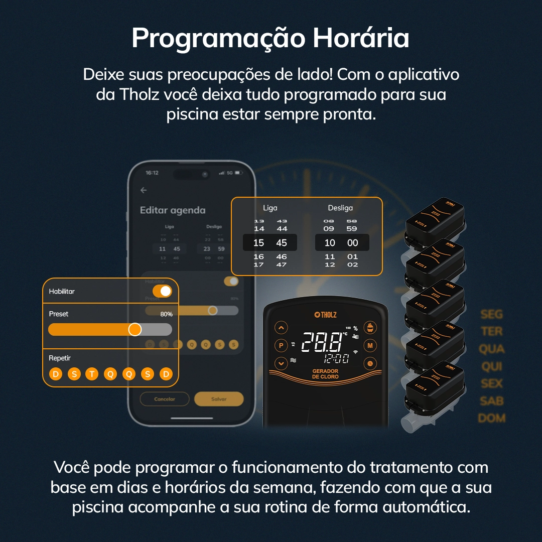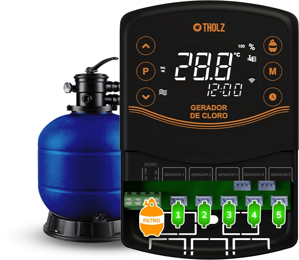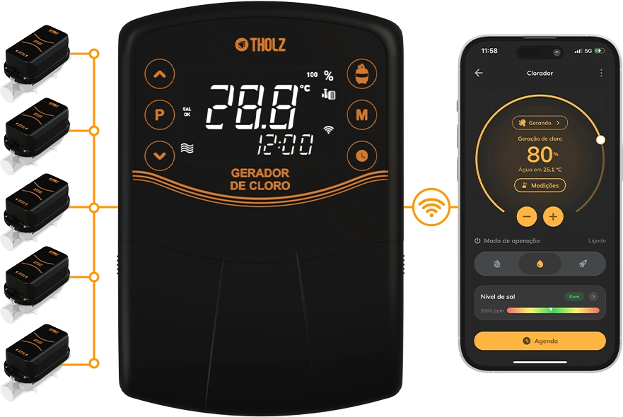 O Módulo Gerador de Cloro Tholz conta com conectividade integrada e tem capacidade para controlar até 5 geradores de cloro.